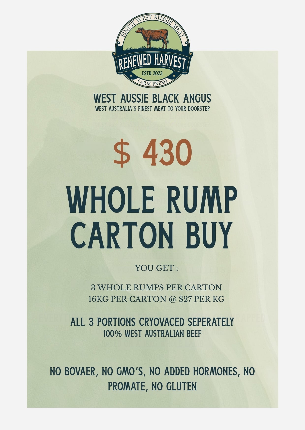 Sold by hook weight. Average side: 58kg @ $18.99/kg. Quality you can taste. Real beef, done right.