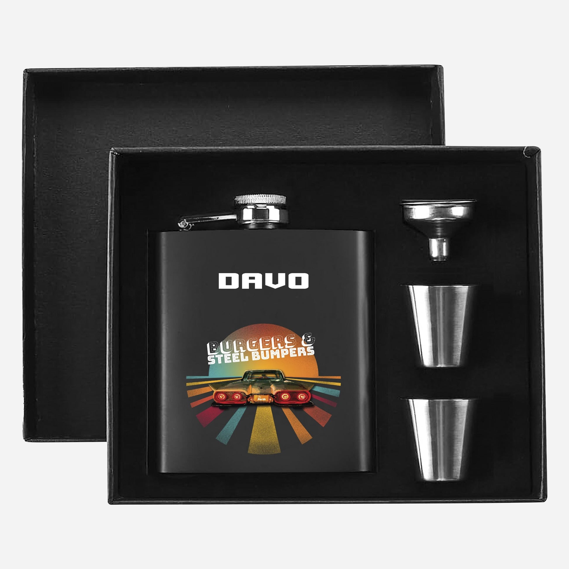 SHOTS YOU SAY! Indulge in some fun with the BURGERS & STEEL BUMPERS FLASK SET. Share some shots with your friends and some late night funnel filling. Joy to the world! #funneloflove