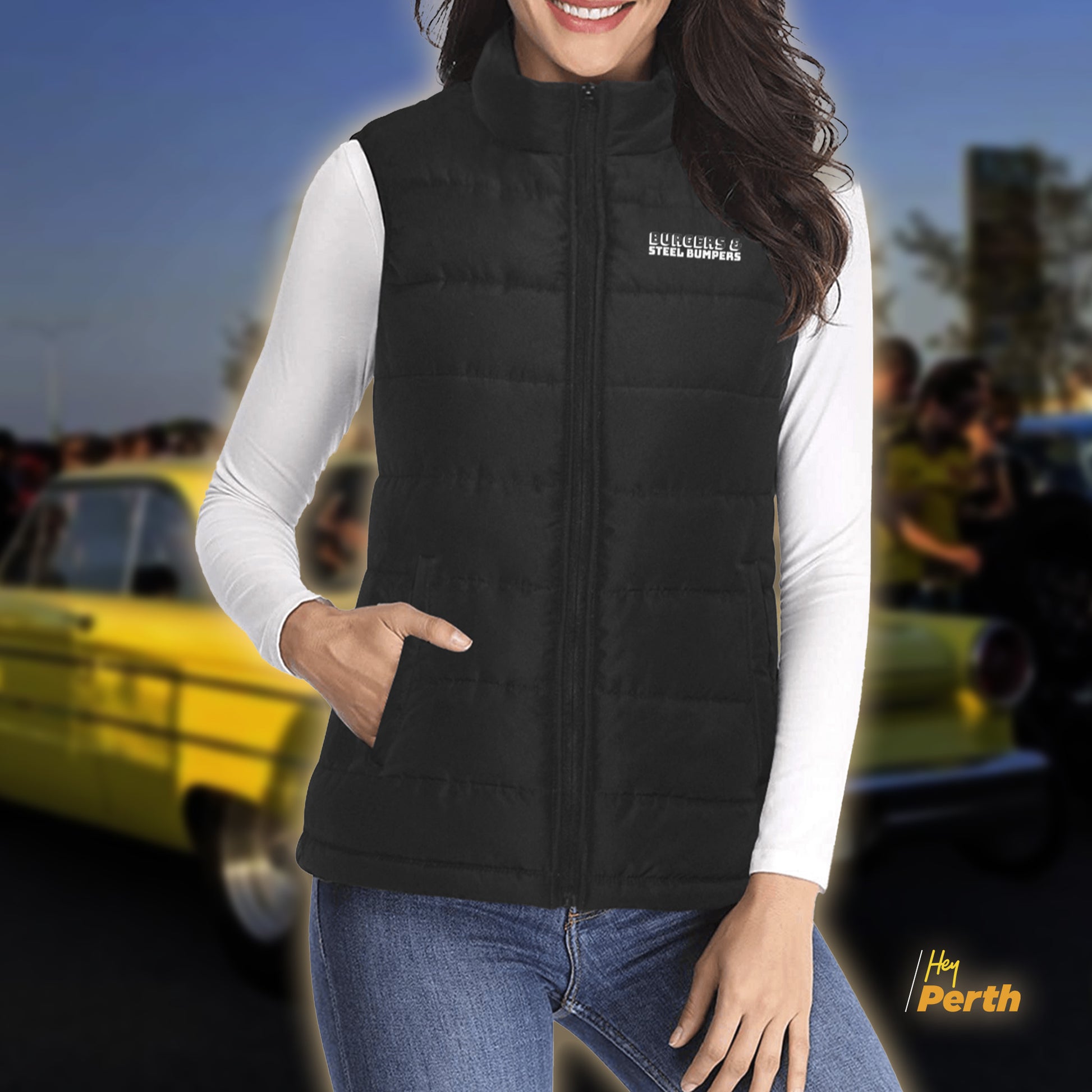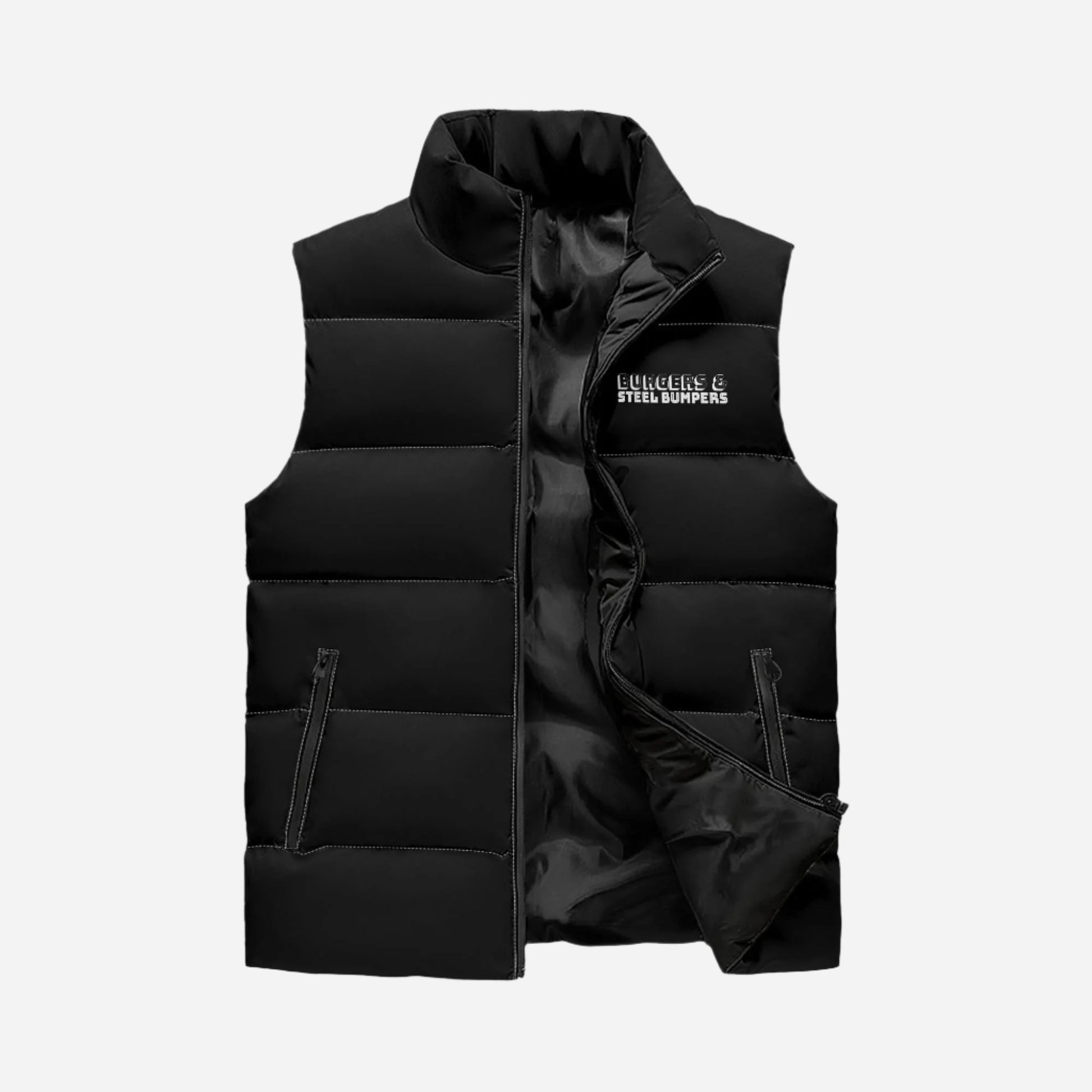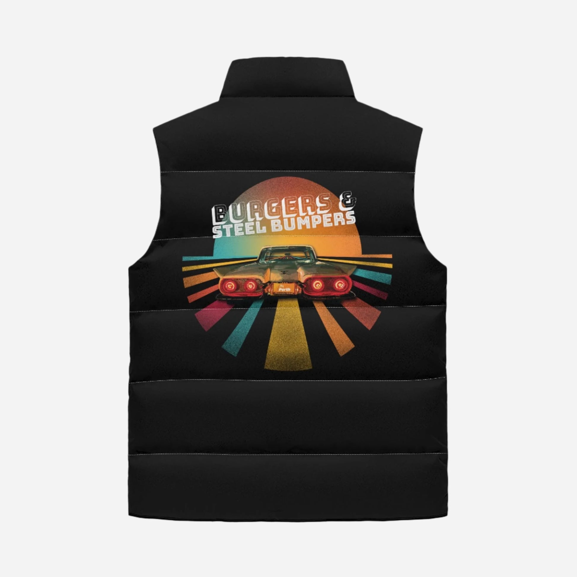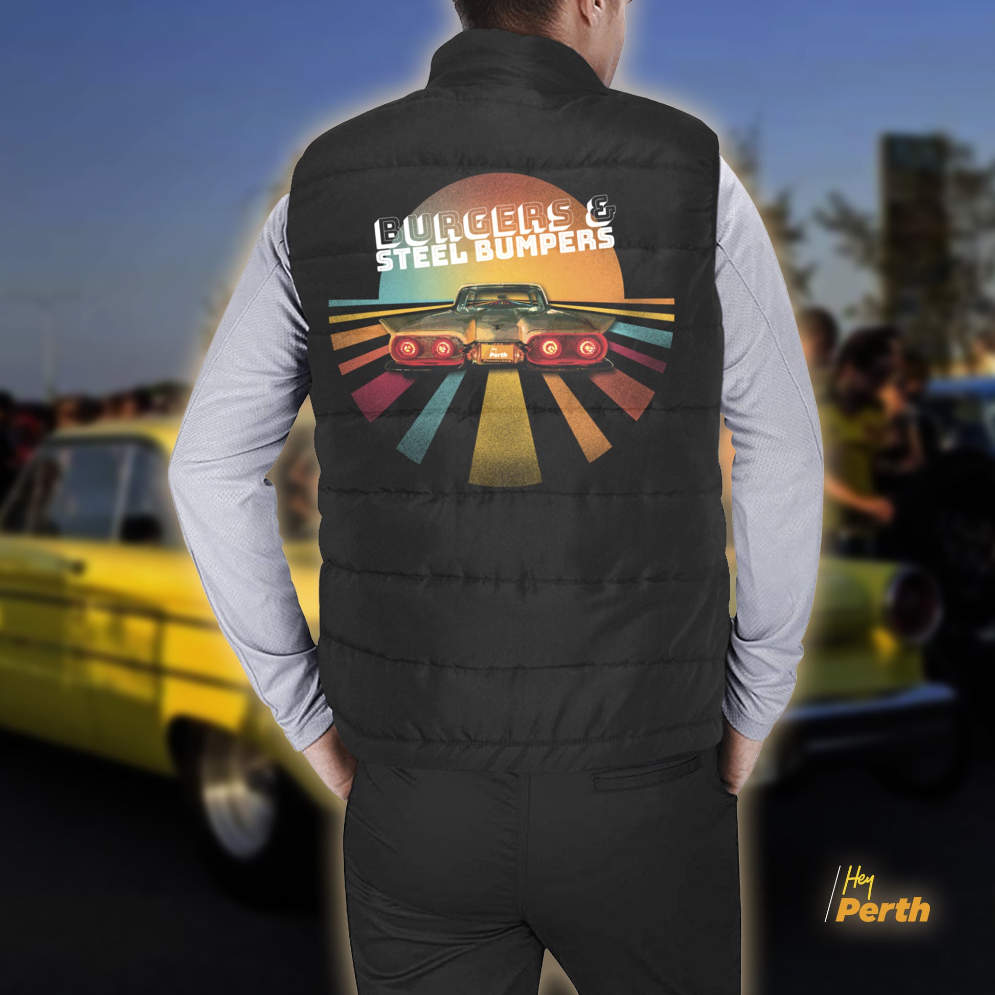 REV UP with the Burgers & Steel Bumpers Puffer vest. If you're into puffing out your chest then this vest does it best! Made for the breezy Burgers & Steel Bumpers nights. Get it on in the parking lots of Perth with this ripper! #puffoutthevest