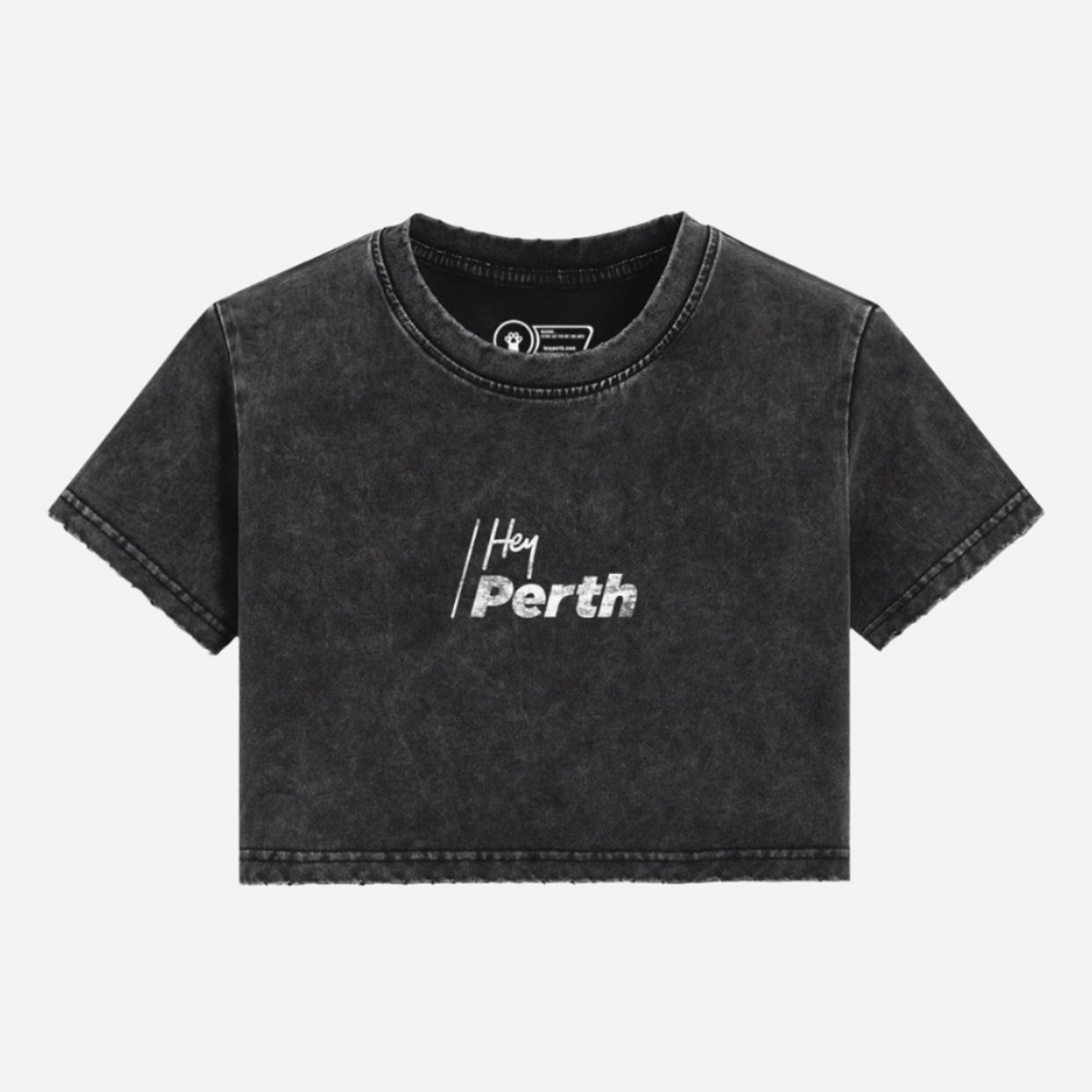 FESTIVAL FLIRTY in the HEY PERTH FADED CROP. Turn heads don't be boring in this faded thread. Say goodbye to the norm and hello to flirty fashion! #cropfest