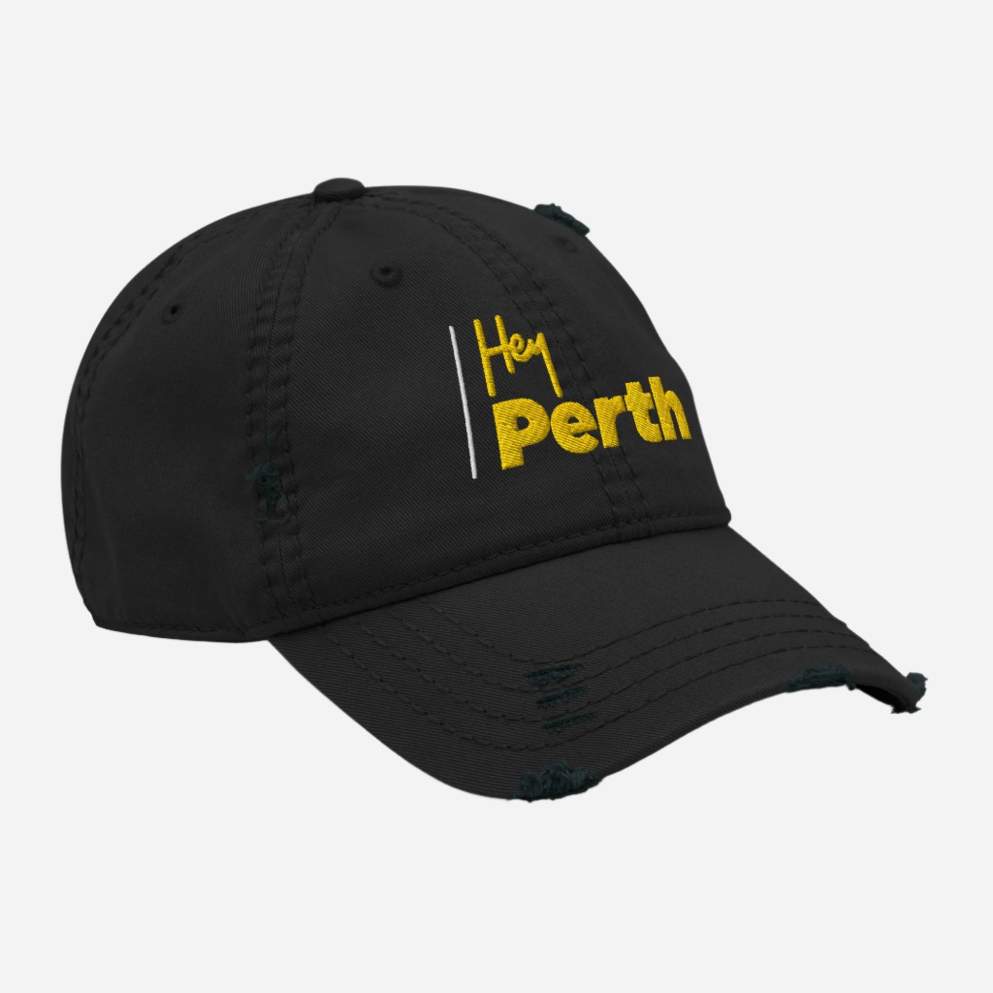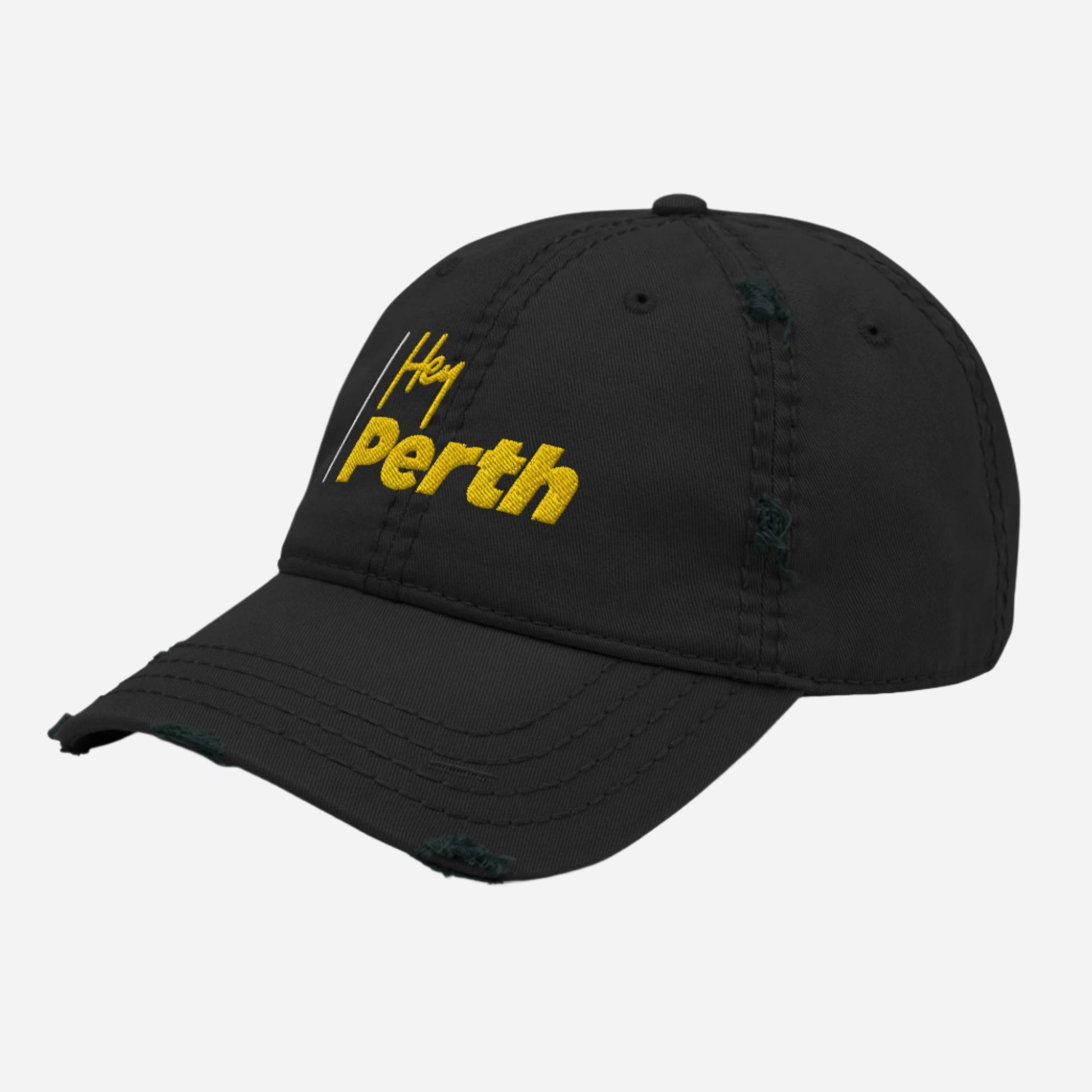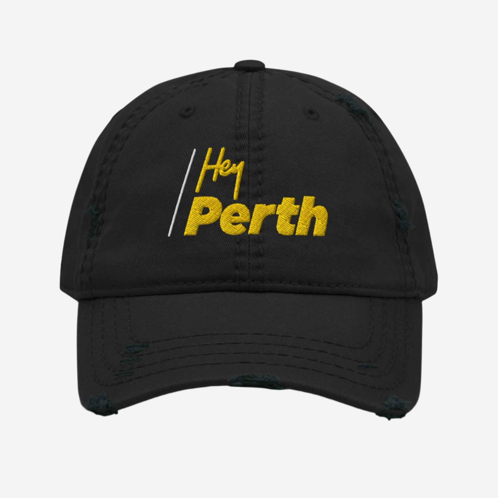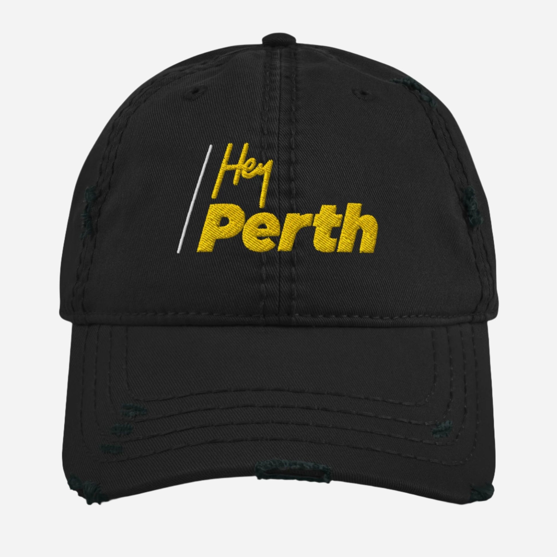 STRESS LESS with the HEY PERTH DISTRESSED CAP! Show some love for the west with this must-have classic looking lid. Forget everything east of the border and take the stress out of distress. It's the perfect way to show west is the best. Hey Perth! #noeasters